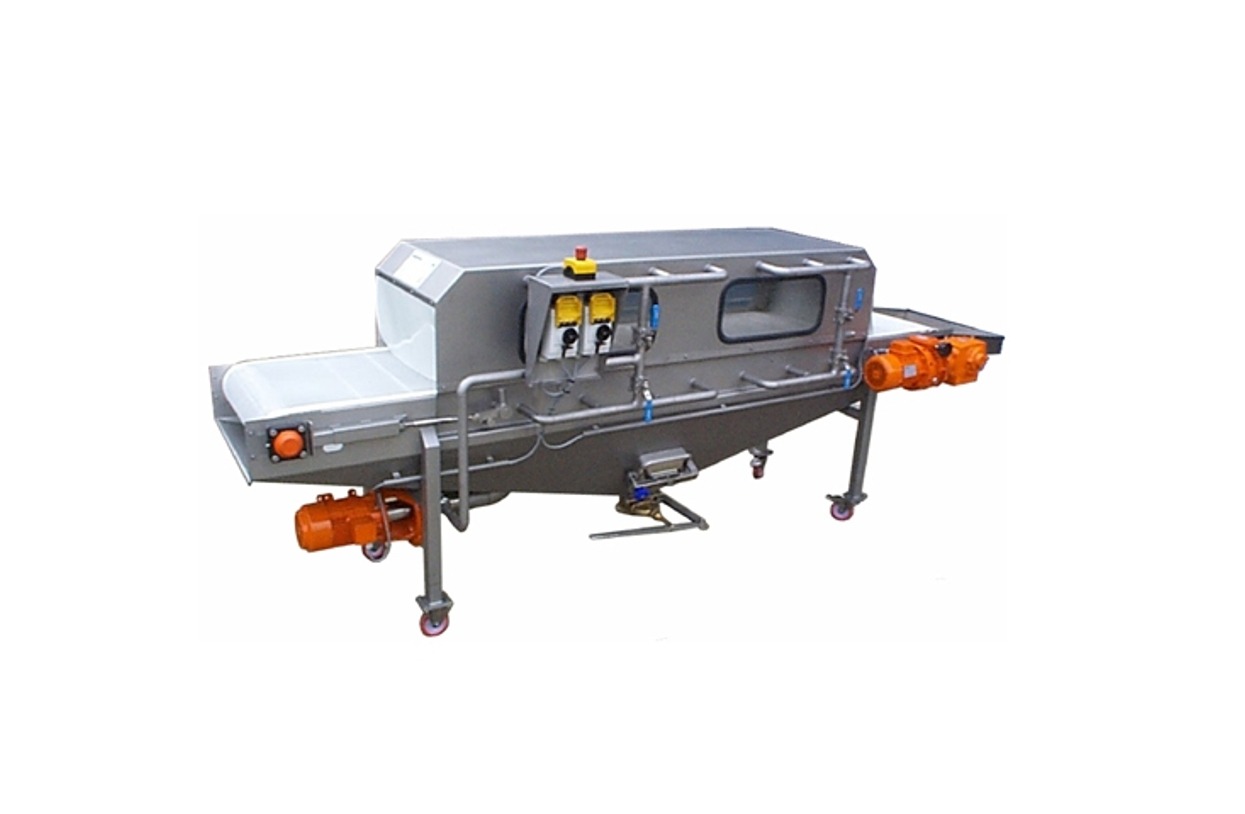A flexible machine for washing of vegetables and fruit in small and medium sized quantities. A recirculation and a fresh water section are provided.