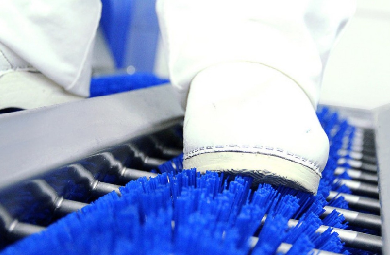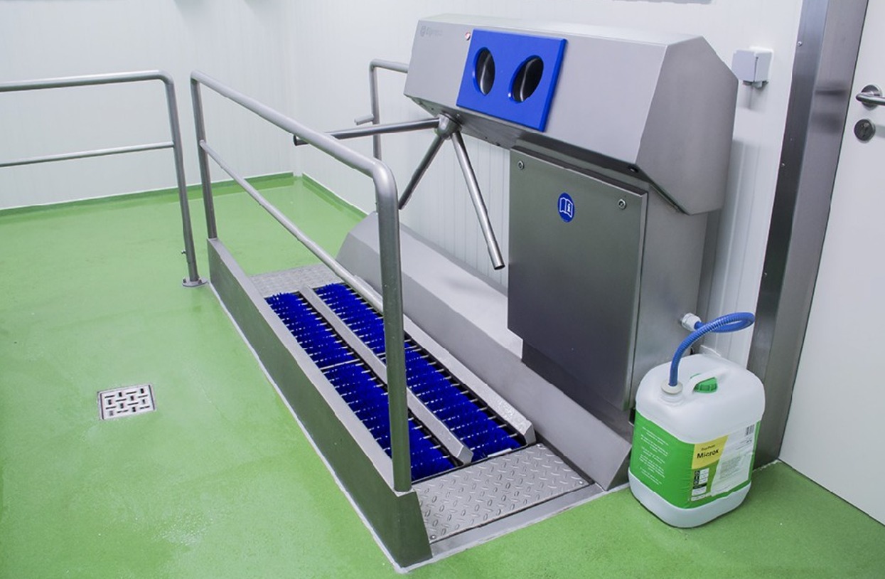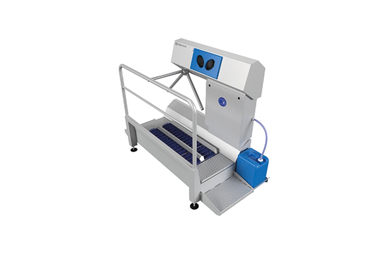 The DZW-HDT does two things at the same time: it cleans the soles and disinfects the hands. The rotating brushes are automatically humidified. The hand disinfection is regulated by sensors. Spray nozzles above and underneath the hand ensure a good atomization of the disinfectant. After the hands have been disinfected, the turnstile will be released and one can proceed to the next room.